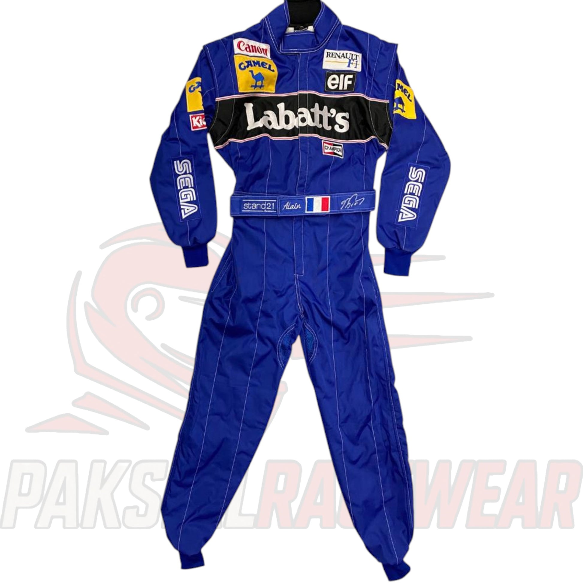 Celebrate the legacy of the four-time Formula One World Champion Alain Prost with this embroidered patch replica race suit. Designed with precision and inspired by the iconic racing suits worn during his legendary career, this suit showcases detailed embroidered patches, sponsor logos, and authentic styling that reflect the golden age of Formula One.