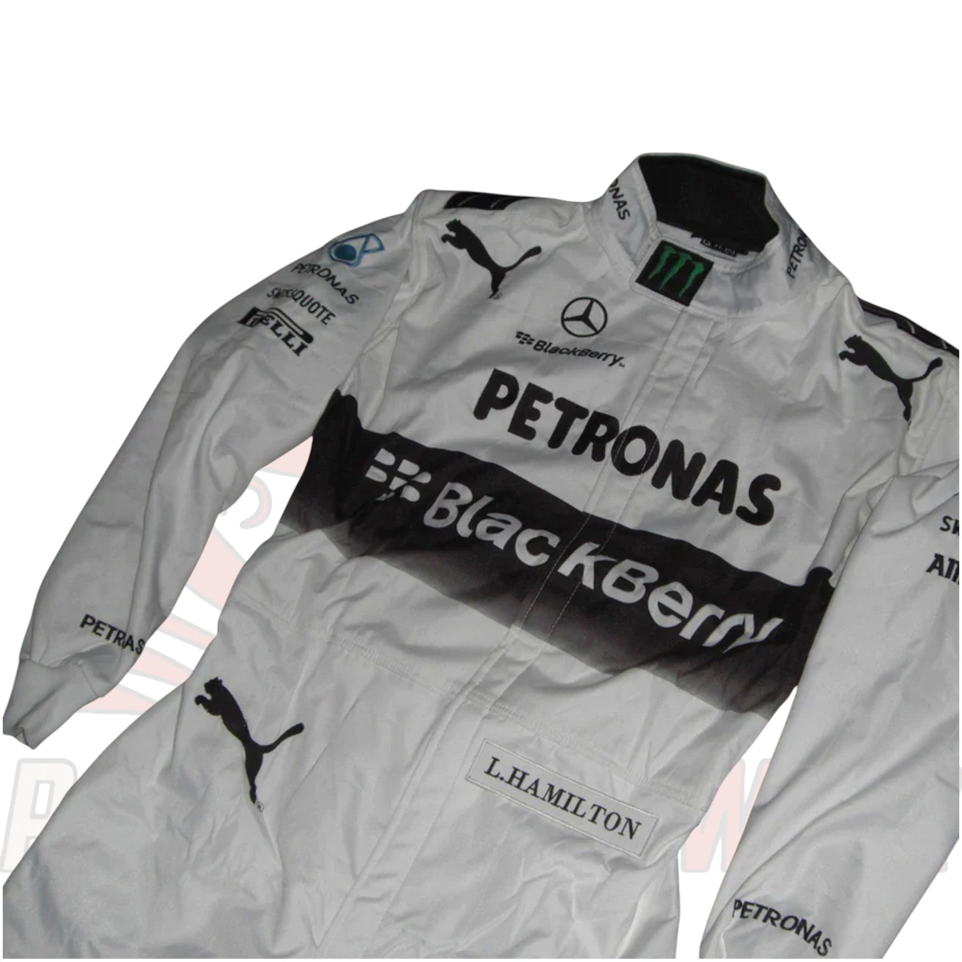 Featuring detailed embroidered patches, Mercedes team branding, and authentic sponsor logos, this suit reflects the iconic white and silver design Hamilton wore during the start of the hybrid era. Constructed with premium lightweight and breathable materials, it’s perfect for karting, sim racing, cosplay, or motorsport collectors who want to own a piece of F1 history.