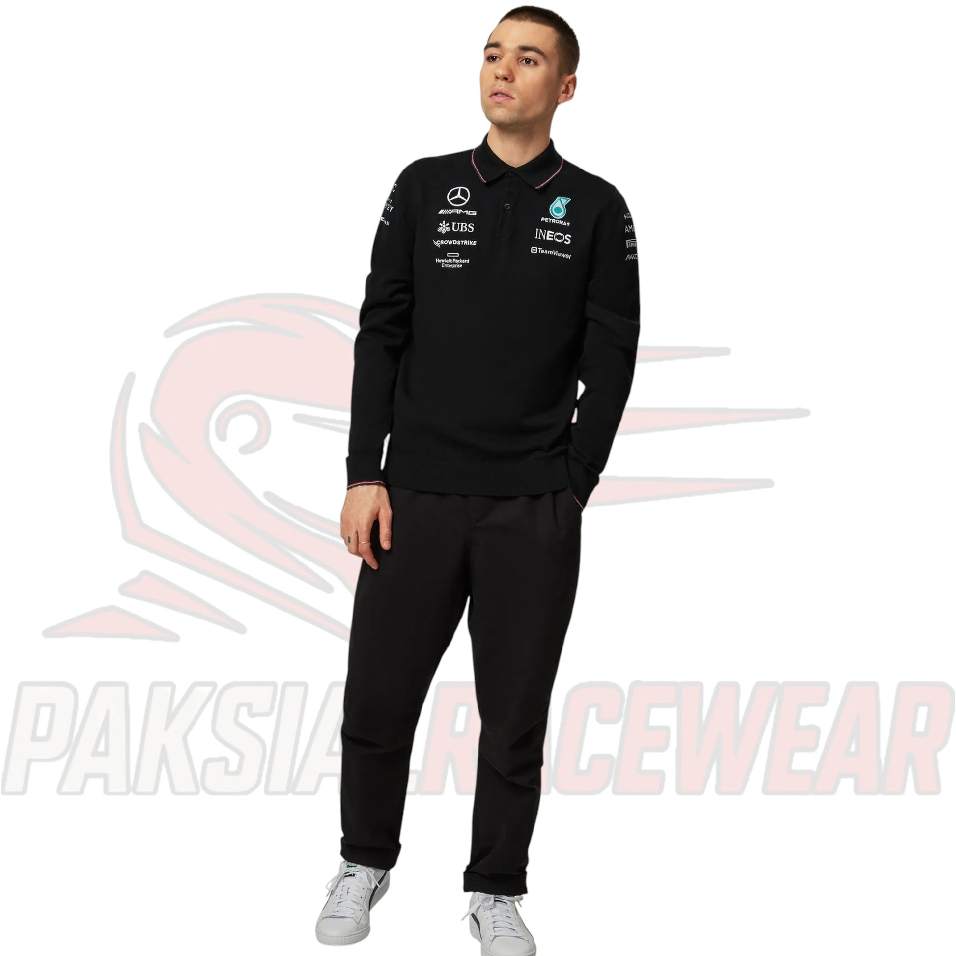 Elevate your wardrobe with the Mercedes-AMG F1 2023 Long Sleeve Knitted Polo, available now from Paksial Racewear — where motorsport passion meets everyday fashion.